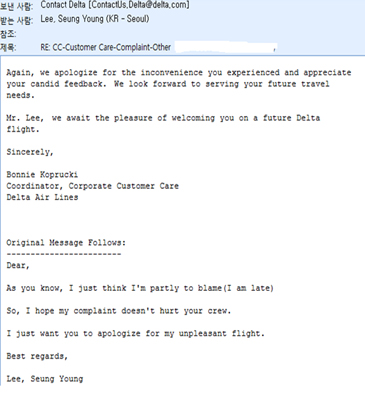 한국에 돌아온 후 Delta항공에 항의글을 올렸고, 사과를 받아내고, 사과의 뜻으로 $50불에 상당하는 Electronic Transportation Credit Voucher도 받았습니다. Delta항공에서는 이문제에 대하여 In-flight leadership team과 협의를 진행할 것이고 앞으로 재발방지를 약속했습니다.