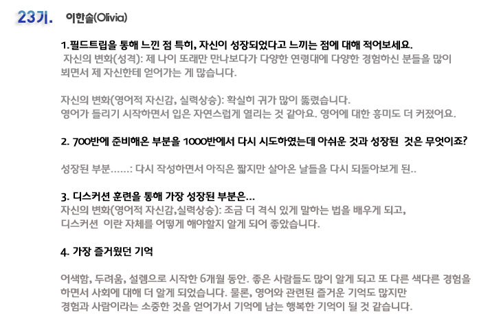 단기 집중 국내 어학연수 23기 이한솔 6개월의 변화과정
