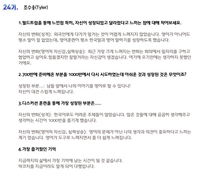 단기 집중 국내 어학연수 24기 조수웅 6개월의 변화과정