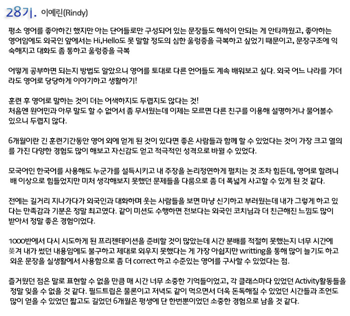 단기 집중 국내 어학연수 28기 이예린 6개월의 변화과정