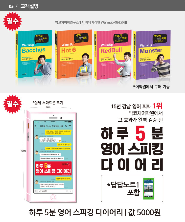 | 『Coach Park 국내어학연수: 기초훈련』은 저자가 영어 강사로 10여년 영어를 가르치며 음성학, 언어학의 많은 이론들을 접했지만, 발음훈련에서는 철저하게 성과가 입증된 내용만을 훈련에 담았다. 수많은 발음 이론들이 있지만 그 중에서 한국인에게 필요한 내용들만 차용했다. 때문에 한국인이 잘 못 알아듣는 발음, 한국인이 잘 내뱉지 못하는 발음을 위주로 발음훈련을 구성했다. | 16,600 |