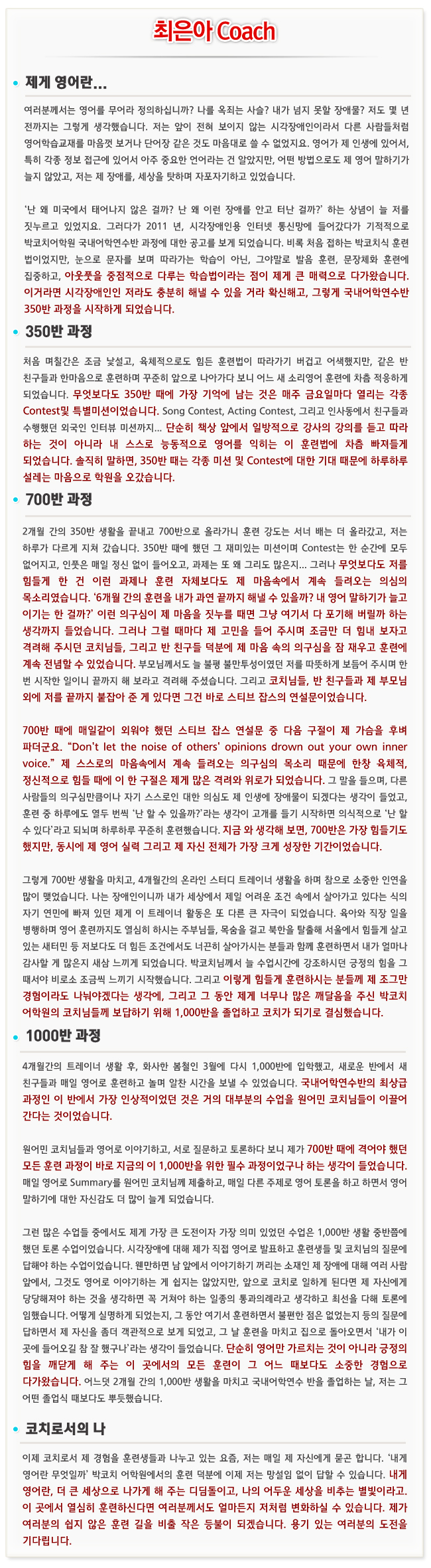 저는 앞이 전혀 보이지 않는 시각장애인이라서 다른 사람들처럼 영어학습교재를 마음껏 보거나 단어장 같은 것도 마음대로 쓸 수 없었지요. 영어가 제 인생에 있어서, 특히 각종 정보 접근에 있어서 아주 중요한 언어라는 건 알았지만, 어떤 방법으로도 제 영어 말하기가 늘지 않았고, 저는 제 장애를, 세상을 탓하며 자포자기하고 있었습니다...