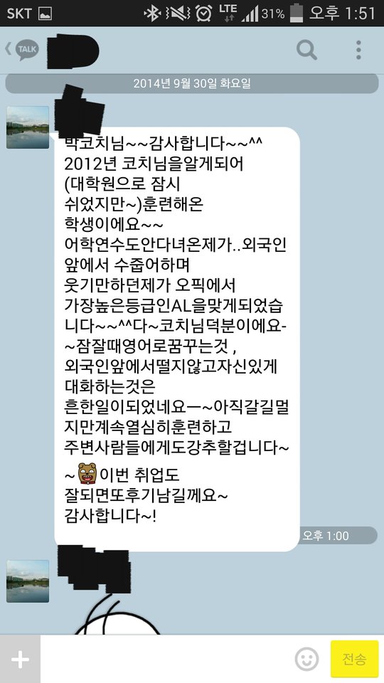 다~ 코치님 덕분이에요~ 잠 잘때 영어로 꿈꾸는 것, 외국인 앞에서 떨지 않고 자신있게 대화하는 것은 흔한 일이 되었네요~ 아직 갈 길 멀지만 계속 열심히 훈련하고 주변사람들엑도 강추할겁니다~ 이번 취업도 잘 되면 또 후기 남길게요~