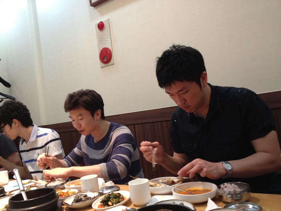 밑의 사진은 식사 중에 찍힌 사진 입니다. 아니죠, 어떤 분에게 도촬 당했습니다;;ㅋ 위에 사진에서 자리 위치를 확인 하시고 아래에 있는 사진에서 찍힌 각도를 추측 해 보시면 누가 도촬 했는 지 알 수 있으실 겁니다.ㅋㅋ
