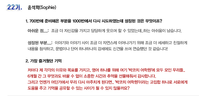 단기 집중 국내 어학연수 22기 이소라 6개월의 변화과정