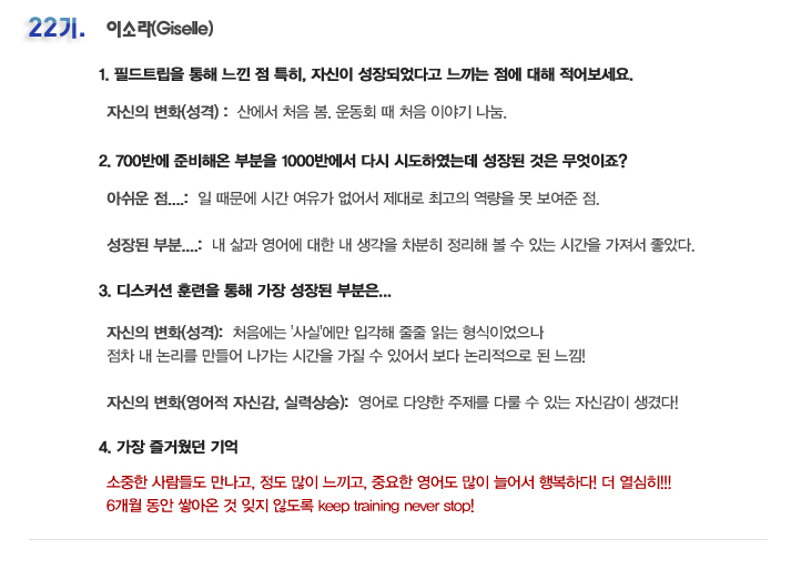 단기 집중 국내 어학연수 22기 이소라 6개월의 변화과정