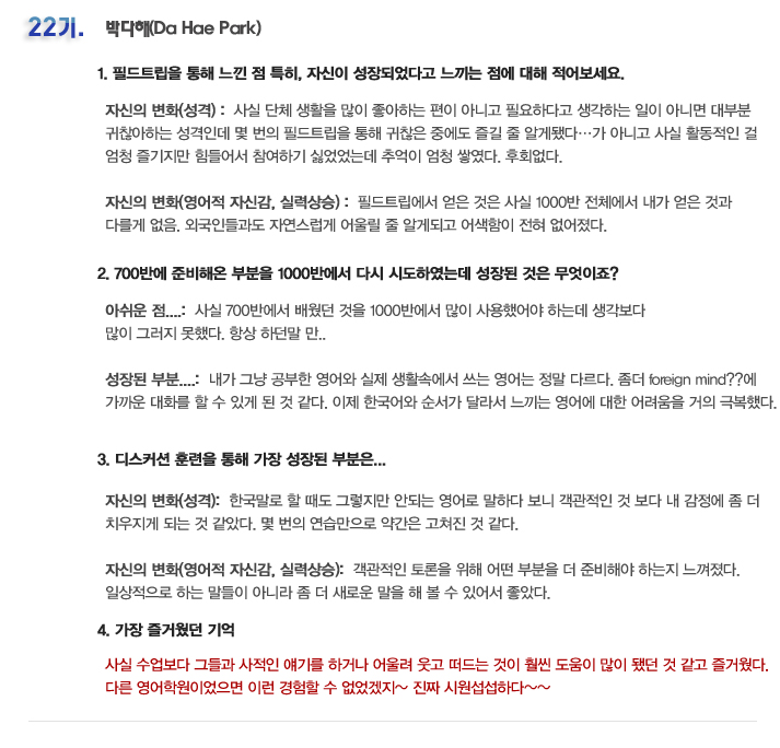단기 집중 국내 어학연수 22기 박다해 6개월의 변화과정