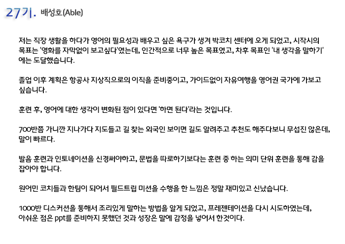 단기 집중 국내 어학연수 27기 배성호 6개월의 변화과정