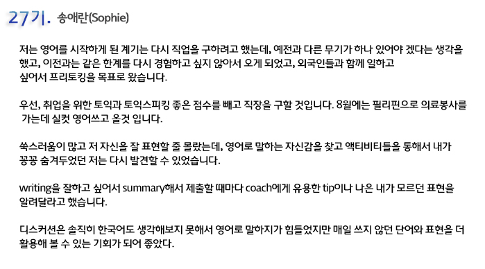 단기 집중 국내 어학연수 27기 송애란 6개월의 변화과정
