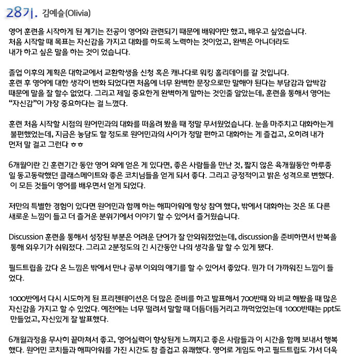 단기 집중 국내 어학연수 28기 김예슬 6개월의 변화과정