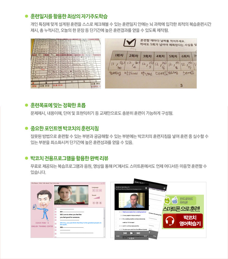 | 『Coach Park 국내어학연수: 기초훈련』은 저자가 영어 강사로 10여년 영어를 가르치며 음성학, 언어학의 많은 이론들을 접했지만, 발음훈련에서는 철저하게 성과가 입증된 내용만을 훈련에 담았다. 수많은 발음 이론들이 있지만 그 중에서 한국인에게 필요한 내용들만 차용했다. 때문에 한국인이 잘 못 알아듣는 발음, 한국인이 잘 내뱉지 못하는 발음을 위주로 발음훈련을 구성했다. | 16,600 |