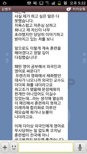 치욕스럽고 자존심 상하고 화나고 제 자신이 너무 초라했지만 당당히 이야기하고 받아치고 있는 저를 보니 앞으로도 이렇게 계속 훈련을 해야겠다고 정말 깊이 다짐했습니다!