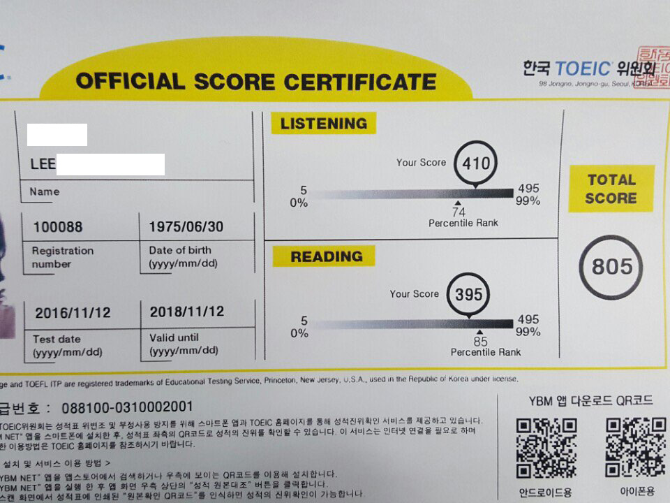 난생 처음 치른 토익에서 805점을 받았어요.